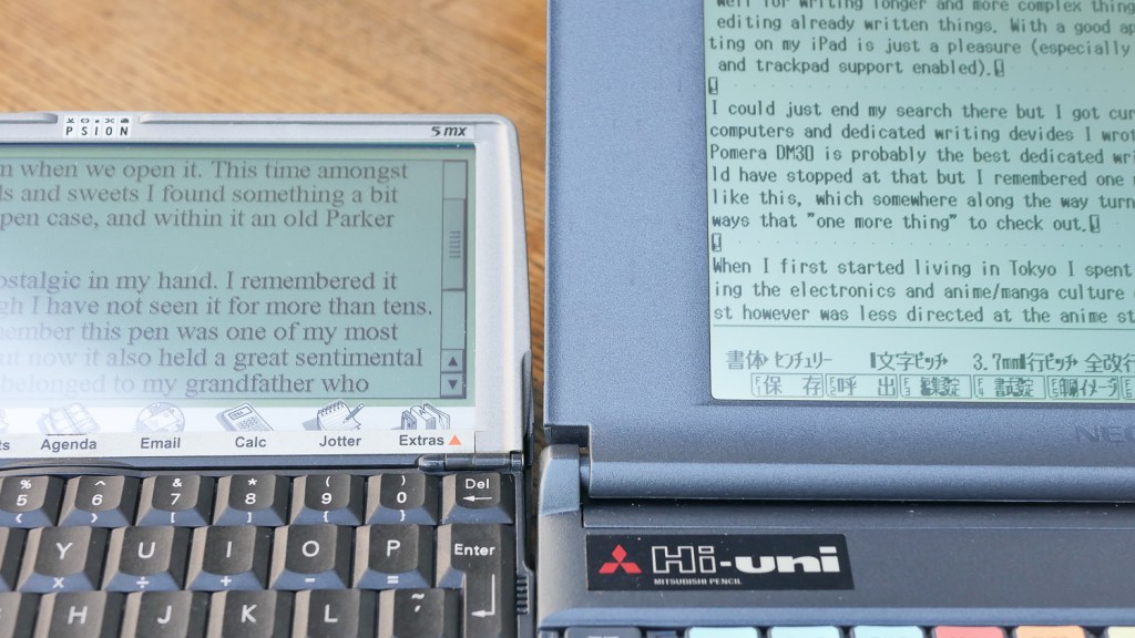 In my first adventure with retro writing devices, I mentioned that I would really like to test the famous Psion 5mx PDA as a candidate for a good portable writing device. I say “famous” because many articles about distraction-free and mobile writing mention this PDA released in 1999 with almost starry-eyed nostalgia. May it be reporting from a war zone or writing a lengthy SF novel, the 5mx is always mentioned as having the best form factor, battery life, and a dream-like mobile keyboard.