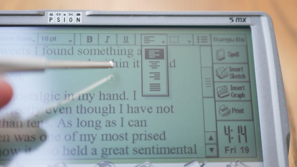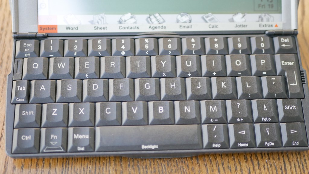 The standard “Word” text editor that comes preinstalled on the Psion 5mx works very well. The scroll is fast and smooth, the fonts render very readable and sharp, and the zoom-in-out feature performed by dedicated touch buttons helps a lot. The app has all the standard features you could expect, like copying, pasting text, but also word count, paragraph styles, search and replace, or even displaying an outline of the document. The interface can be hidden away, so we get the whole screen for text. Standard keyboard shortcuts, like Ctrl+B for bold, can be used too, and some key combos allow for writing special characters that sometimes come in useful (if you need that em-dash, for example). Overall, this is the best mobile text editor I have had the pleasure to work with so far. The only downside is that it uses only TXT or its own EPOC Word file format. You need this second format to get all the rich text formatting onto your computer.