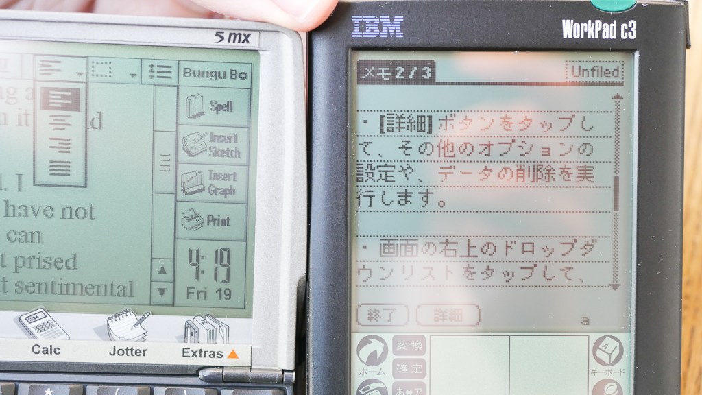 Great! I inserted two AA batteries (another plus – I don’t have to worry about old re-chargeable batteries not holding their juice) and started up the system. I was immediately surprised by how fast and snappy this PDA is. Compared to it, the Cassiopeia I reviewed before feels like a primitive toy. Even by today’s standards, the applications respond fast, and the screen does not ghost so bad. I installed some additional software for writing that I had ready and started testing.
