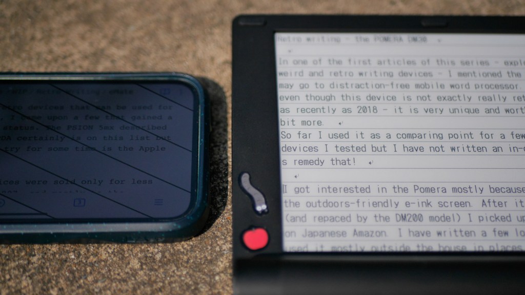 I tried to compare the Pomera to my iPhone’s display at 100% brightness and capture some after-images on the last photo: