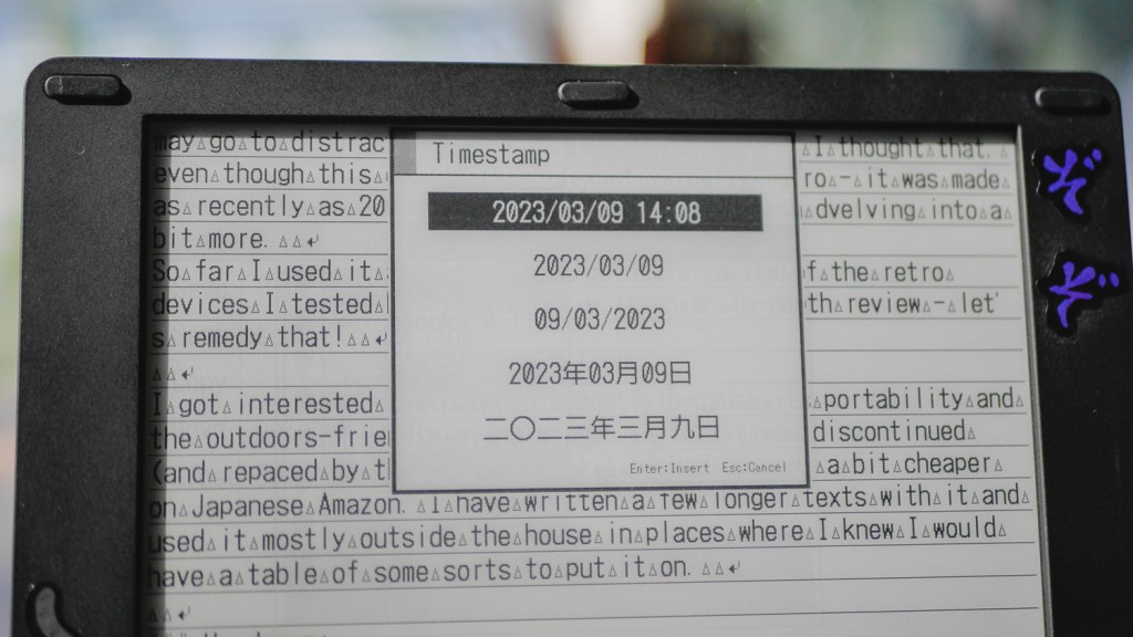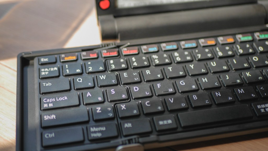 But, we also have to remember that this tool is mostly aimed at writing in Japanese, so the device also has a powerful kanji conversion system the ATOK Professional installed – this makes writing in Japanese almost as fluid as on a regular laptop, or maybe better even in some cases! There is a downside, though – from what I can tell, the device also uses the Japanese SHIFT_JIS codepage for the text files and not UTF_8, so a bit of “conversion magick” might be necessary to open the files correctly on the laptop side.