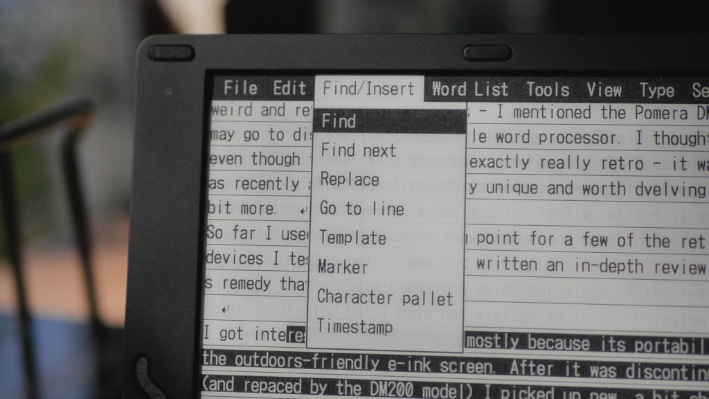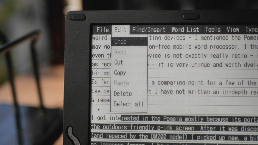 The screen’s e-ink character forces one more issue – refreshing. If you have and use an e-ink sporting e-book reader (like a Kindle), you probably noticed that when you change the contents displayed, the screen briefly flashes black to turn to the next page – this is done to “clean” the screen from the previous contents. While writing on the Pomera, the device cannot just flash the whole screen at us with each written letter, so it uses a technique called “partial refresh” – just changing the parts of the picture that need updating. This works fairly well when we are just typing the next word, but any bigger action – adding or moving portions of text, displaying menus, etc. produces artifacts – after images of the previously displayed contents that remain on the screen as darker gray “smudges” under the text.