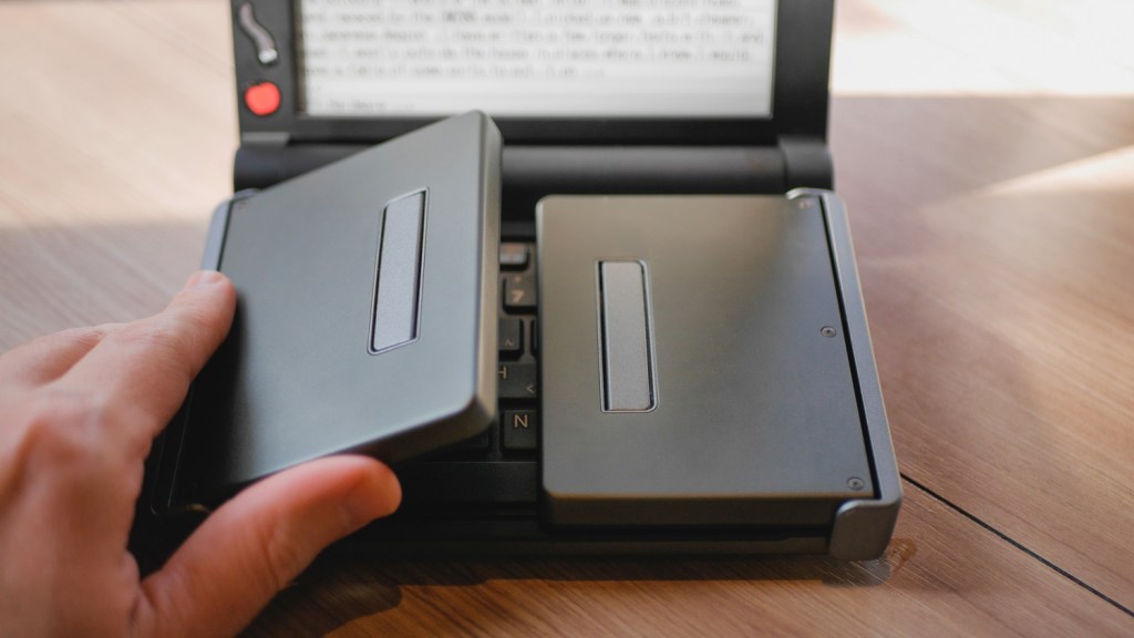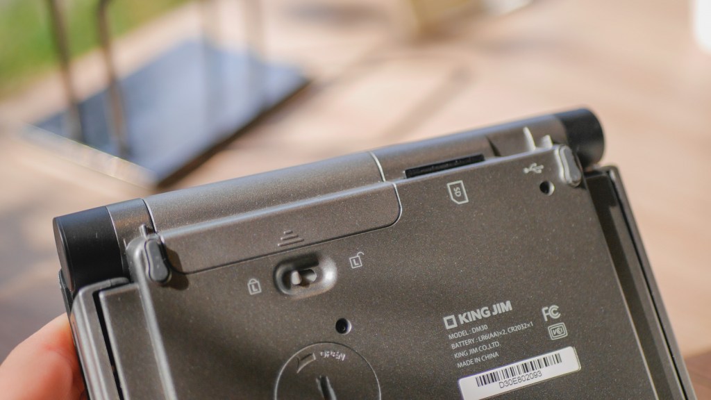The Pomera DM30 is unique hardware-vise because it has not only a screen that folds down like in a miniature laptop but also a keyboard that is split into three parts so the left and right “wings” can fold up too. When the device is fully folded, it makes a dense, heavy brick, even though it’s all made of plastic. (It weighs 450 grams without batteries).