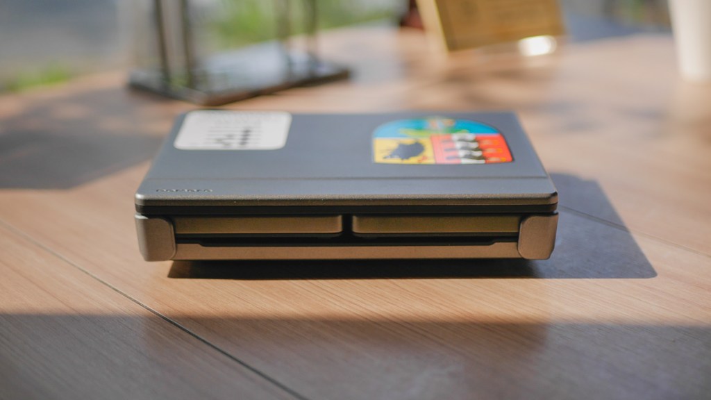 The keys on the DM30 are smaller than in a laptop keyboard and more spaced apart, but because they are also nicely stable and “clicky” a bit, the typing experience is not bad at all. I actually enjoy the slightly retro feel it gives. The keyboard has an additional F-key row that can be programmed with your favorite menu options (I put some homemade stickers there to know what is what) and a MENU key for accessing the device’s menus and file management options. We also get a power button that allows us to sleep and wake the device without needing to fold it each time.
