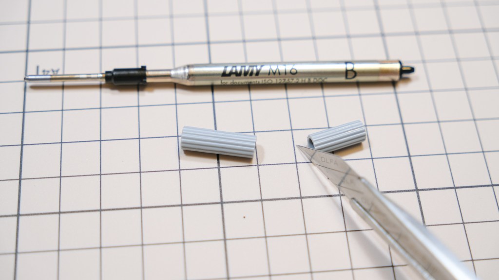 Actually, adapting the refills was very simple: the ballpoint pen LAMY M16 refills come with a plastic cap that can be used quite nicely to extend the refill barrel, and a bit of scotch tape is the only other thing that’s needed!