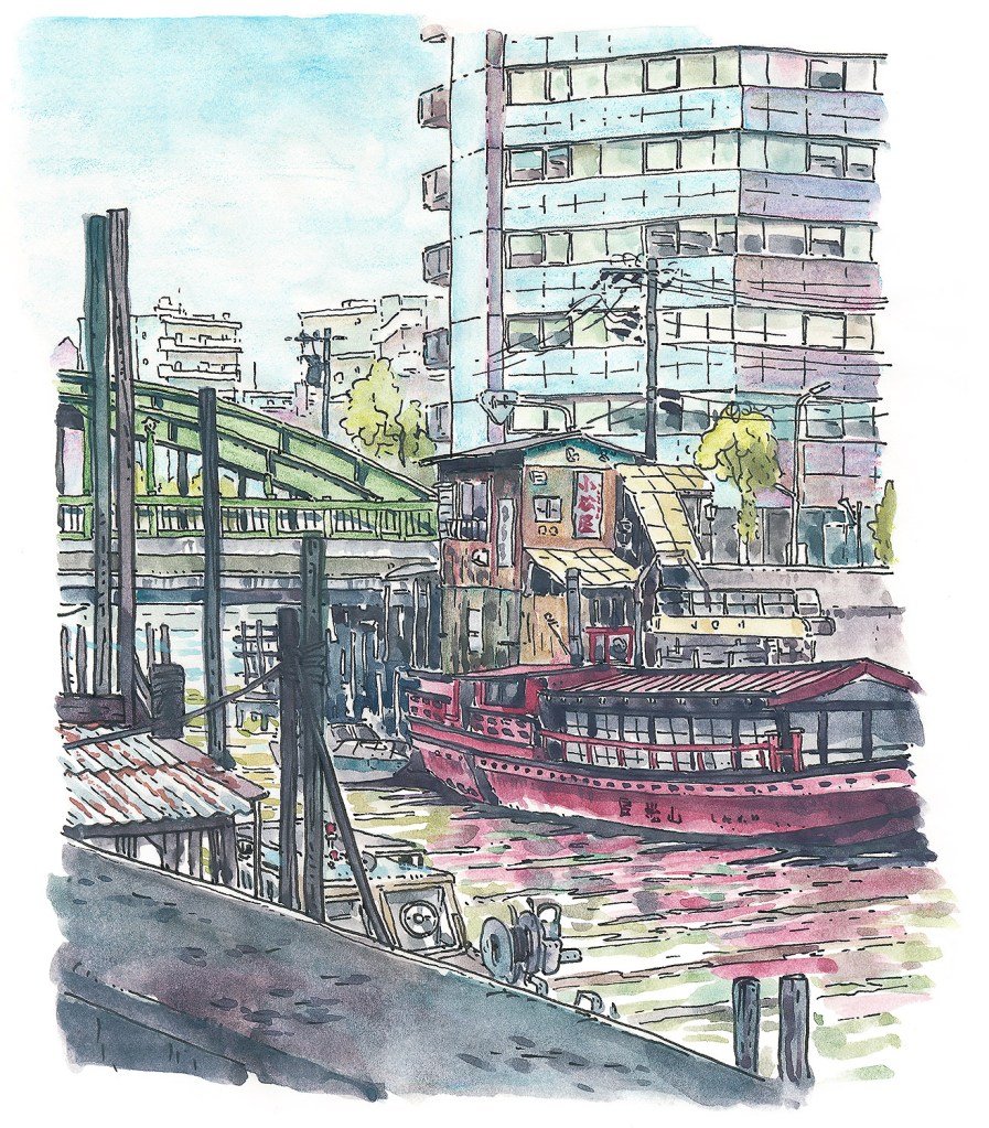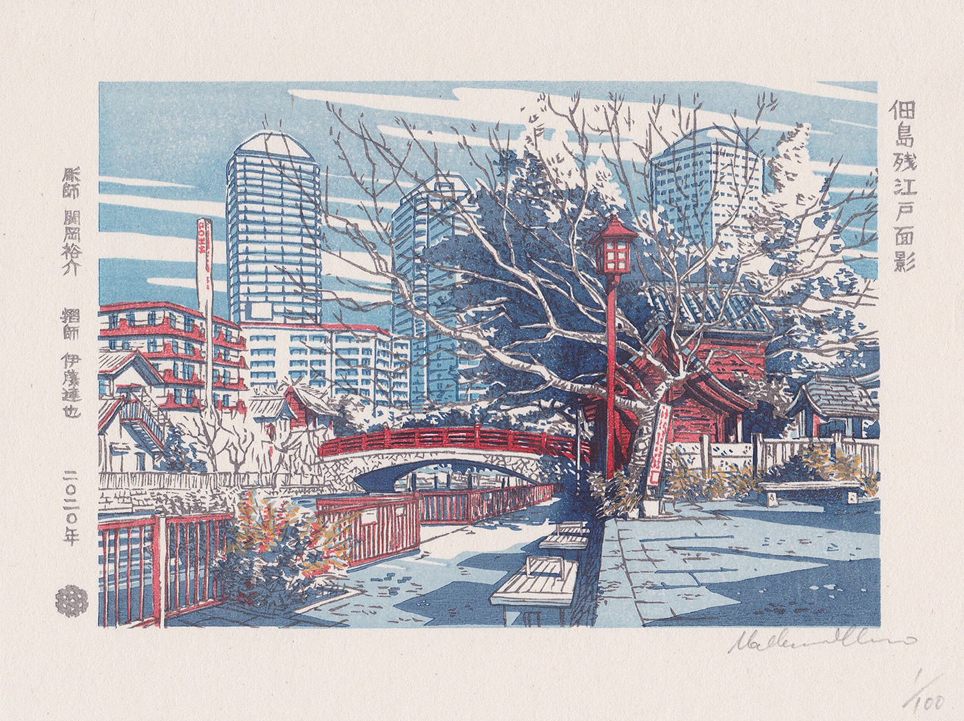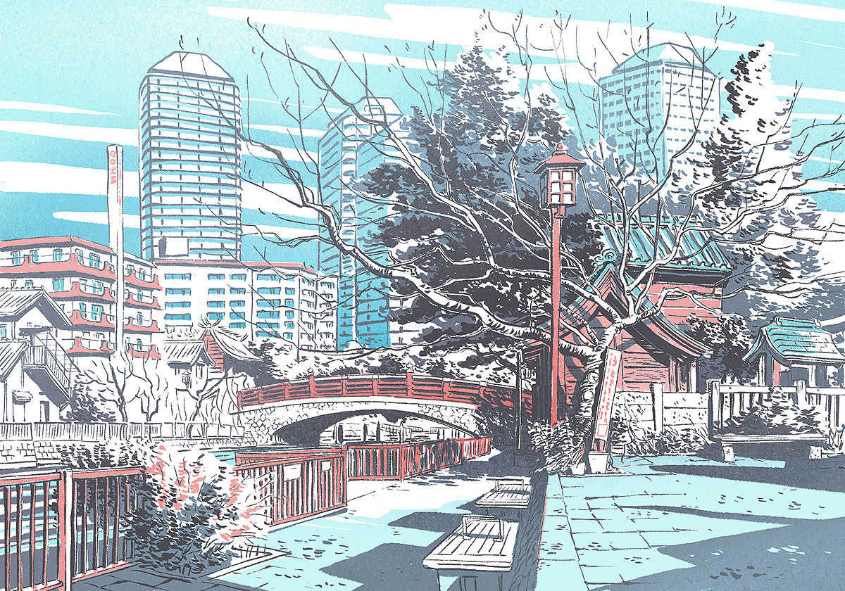 I was asked by the UKIYO-E Project to produce an illustration that would be later used as a base for a series of Japanese, traditional “ukiyo-e” woodblock prints. I drew a landscape ukiyo-e depicting Tsukuda, a neighborhood next to Tsukishima station in the east of Tokyo. In it, I tried to capture the striking contrast between the modern architecture and historical elements that co-exist in harmony in Tsukuda today in the design.