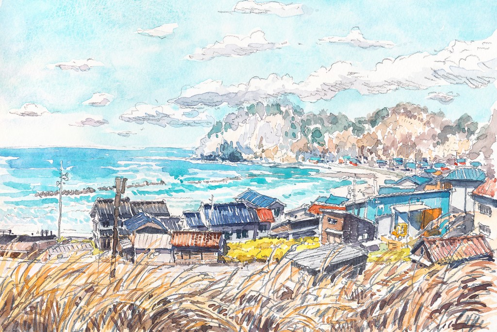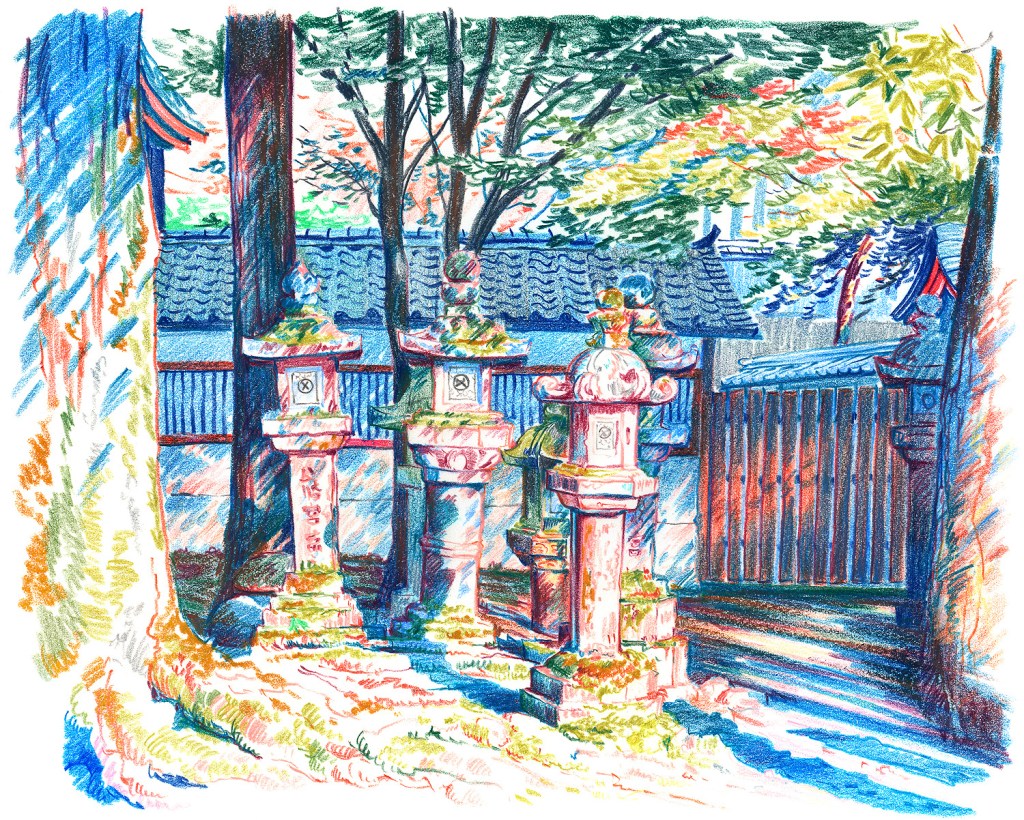 This series of illustrations started with the cover image for my 2022 book “Kuradashi.” When making this watercolor and pencil painting, I focused more on the atmosphere and feelings I wanted to convey instead of just following an interesting photo as a reference. I imagined a scene containing a Kura (Japanese warehouse) being open on a windy but bright autumn day from scratch, making a lot of rough thumbnails and sketches and exploring the idea deeply before starting the final image. To my surprise, the contents of the picture flowed from my imagination quite freely, and I had just to look up and confirm a few architectural details of the iconic design of the building to finish the illustration. The experience of making this image was so refreshing, and I liked the result enough that I tried to capture similar atmosphere-based ideas in a series of works.
