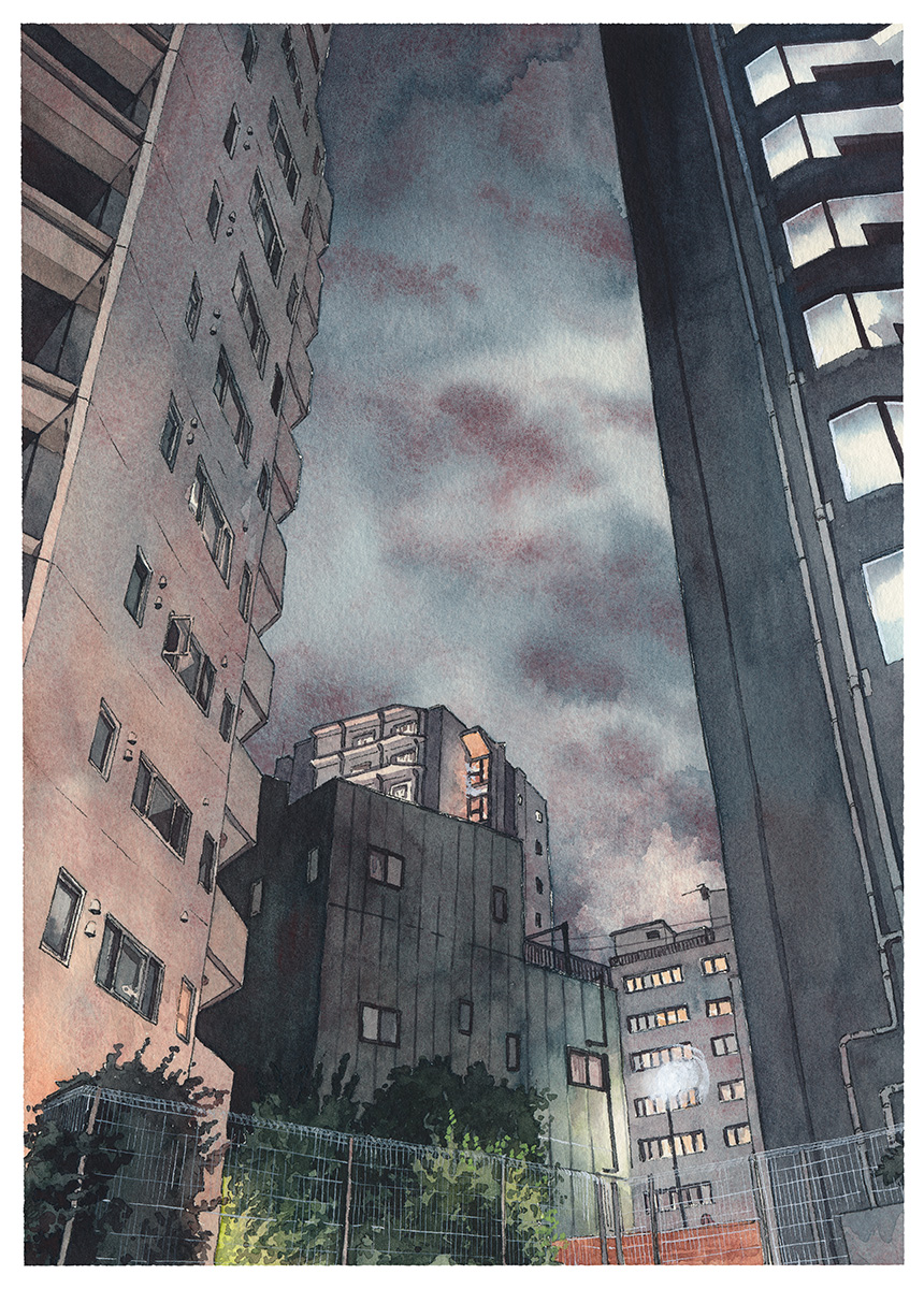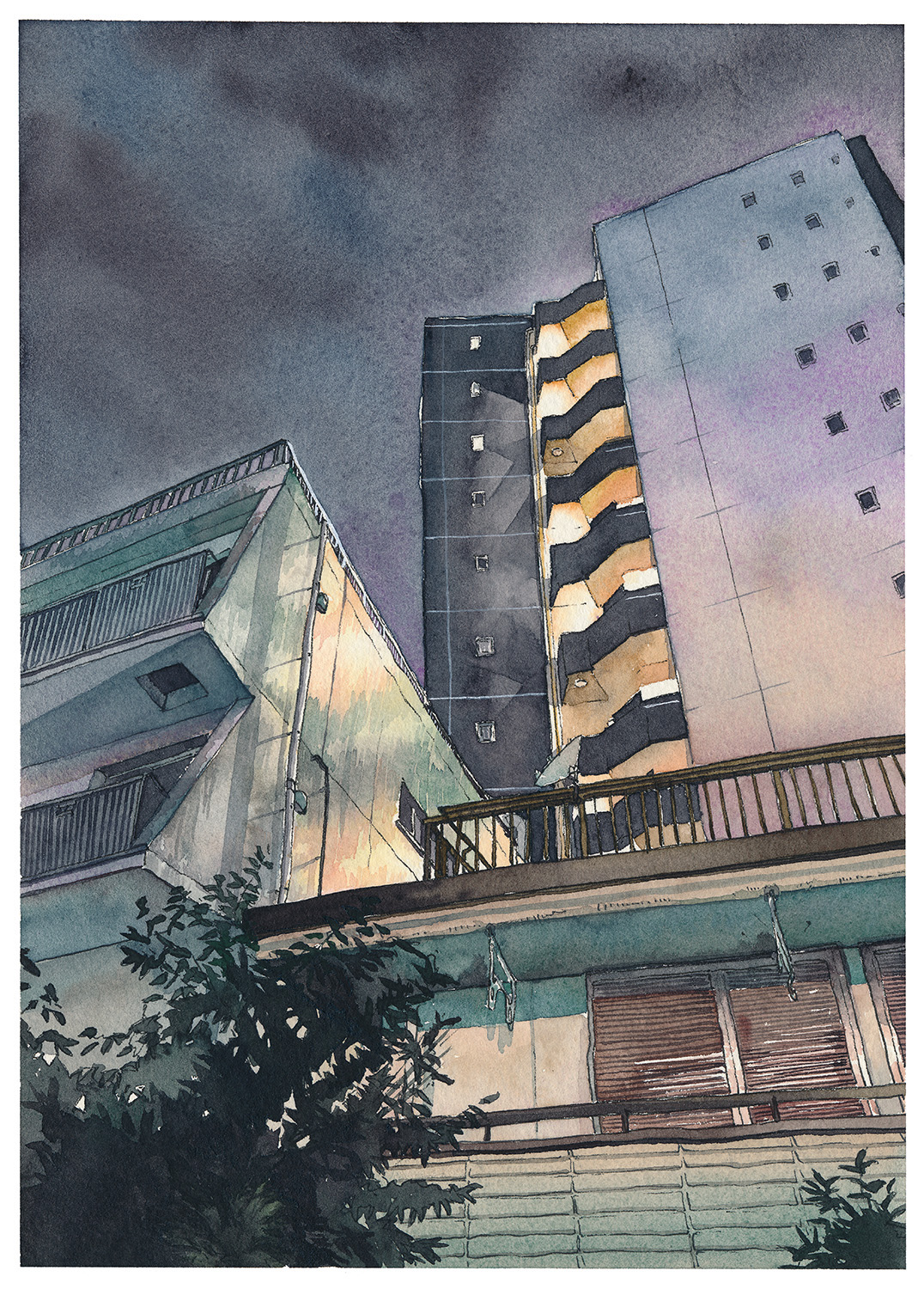 As with a lot of my series work, I painted the first piece more as a test of my abilities to render things like this with only watercolors. This was quite a challenge – with the cloudy, stormy sky and the apartment block’s wall lit up with the last light of the day.