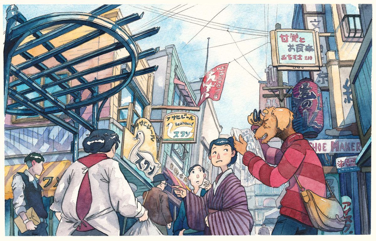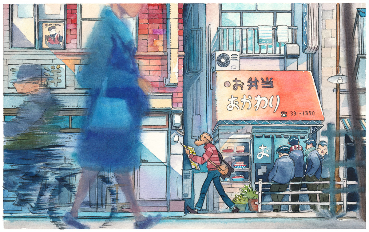 So, together with Kana, we started thinking about how a more pleasant to live in city would look like. I tried to imagine everyday scenes from such a place without making them look too nostalgic and unobtainable. It’s not the “rose-colored” past or a world from an animated movie that will never come to be. I’m tried to paint a city that could exist in Japan even now.