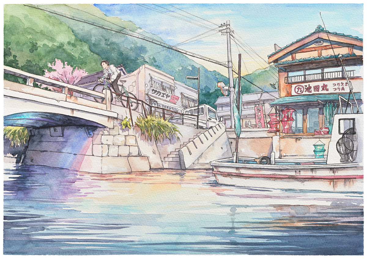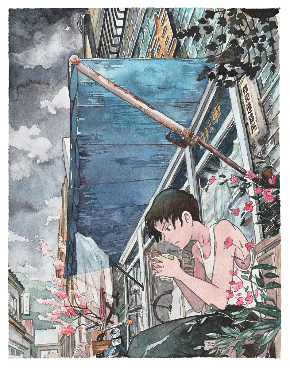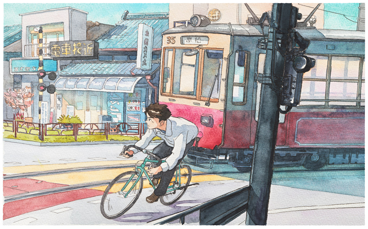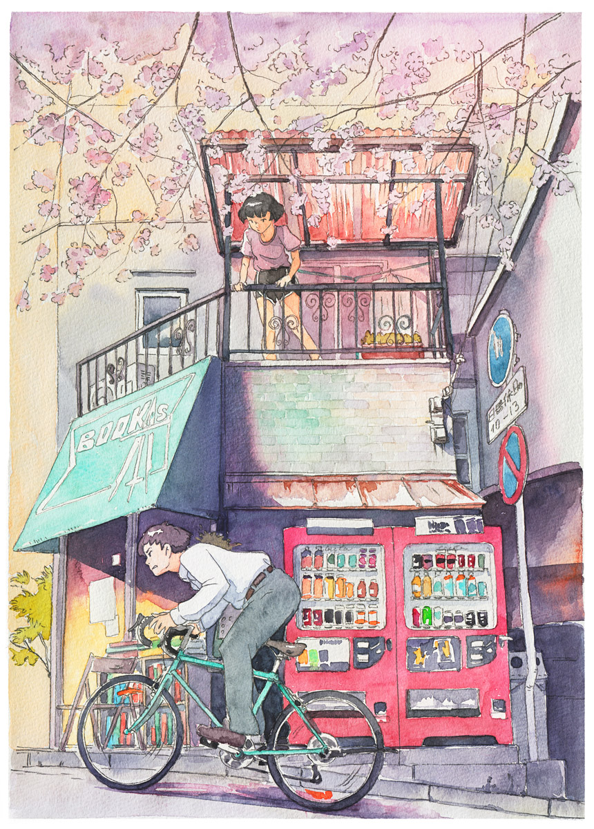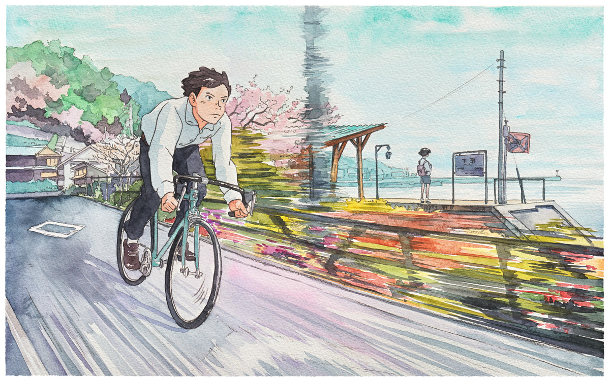 This project started as something I did just for fun in my free time. Inspired by the animated Studio Ghibli movie “Whisper of the Heart” and its original setting location Seiseki Sakuragaoka in Tokyo, I did the first watercolor illustration which quickly spread through the Internet. Following this I decided to make a 10 piece series about the bicycling-it-hard-boy through his day as he fights to reach his goal.