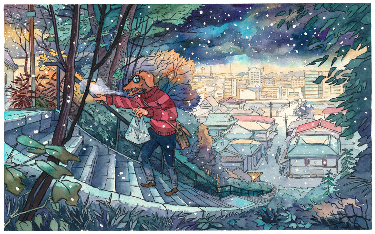 I wanted to do an illustration series showing Yokohama as I see it in my head – a modern, lively city but with this nostalgic feel to it. Also there is nothing better than a story ending with a hot-pot party on a chilly snow day!